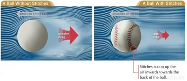 When a round object like a ball is thrown, the front part of the ball hits the air, increasing the air pressure there while the air becomes thinner at the back of the ball, making the air pressure low. This difference in air pressure creates an unwanted effect called "drag" that literally drags the ball backward and slows it down. This is where the stitches come into play.