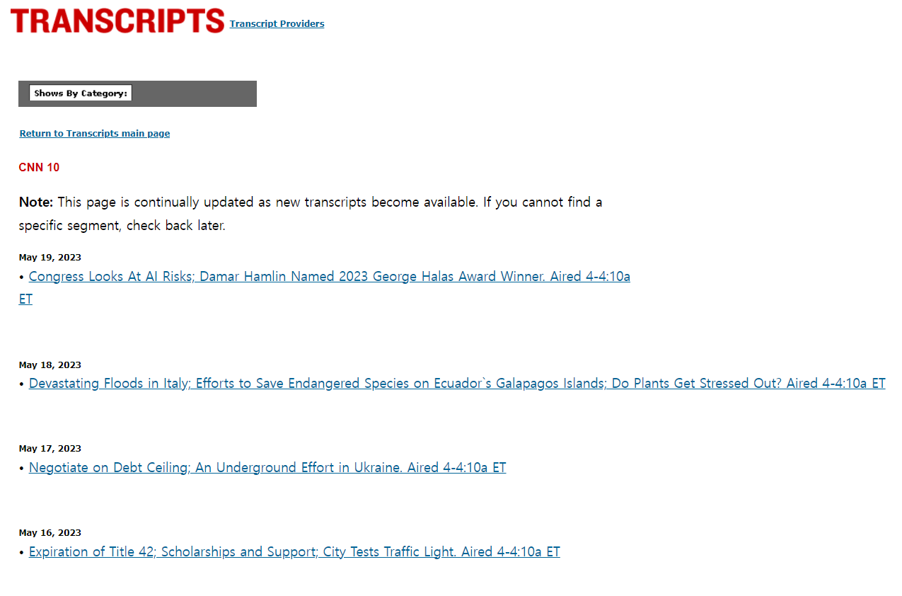 Return to Transcripts main page CNN 10 Note: This page is continually updated as new transcripts become available. If you cannot find a specific segment, check back later. May 19, 2023 May 18, 2023 May 17, 2023 May 16, 2023 May 15, 2023 May 12, 2023 May 11